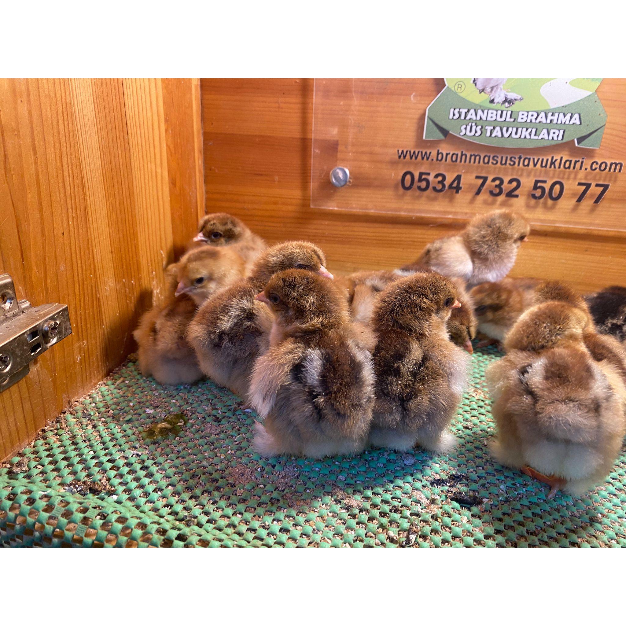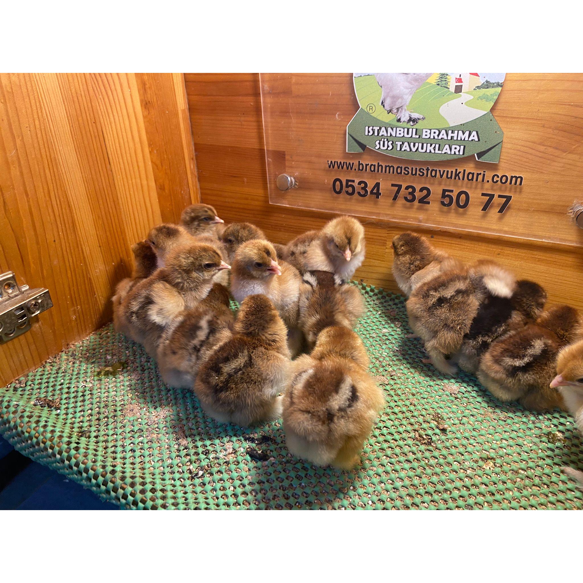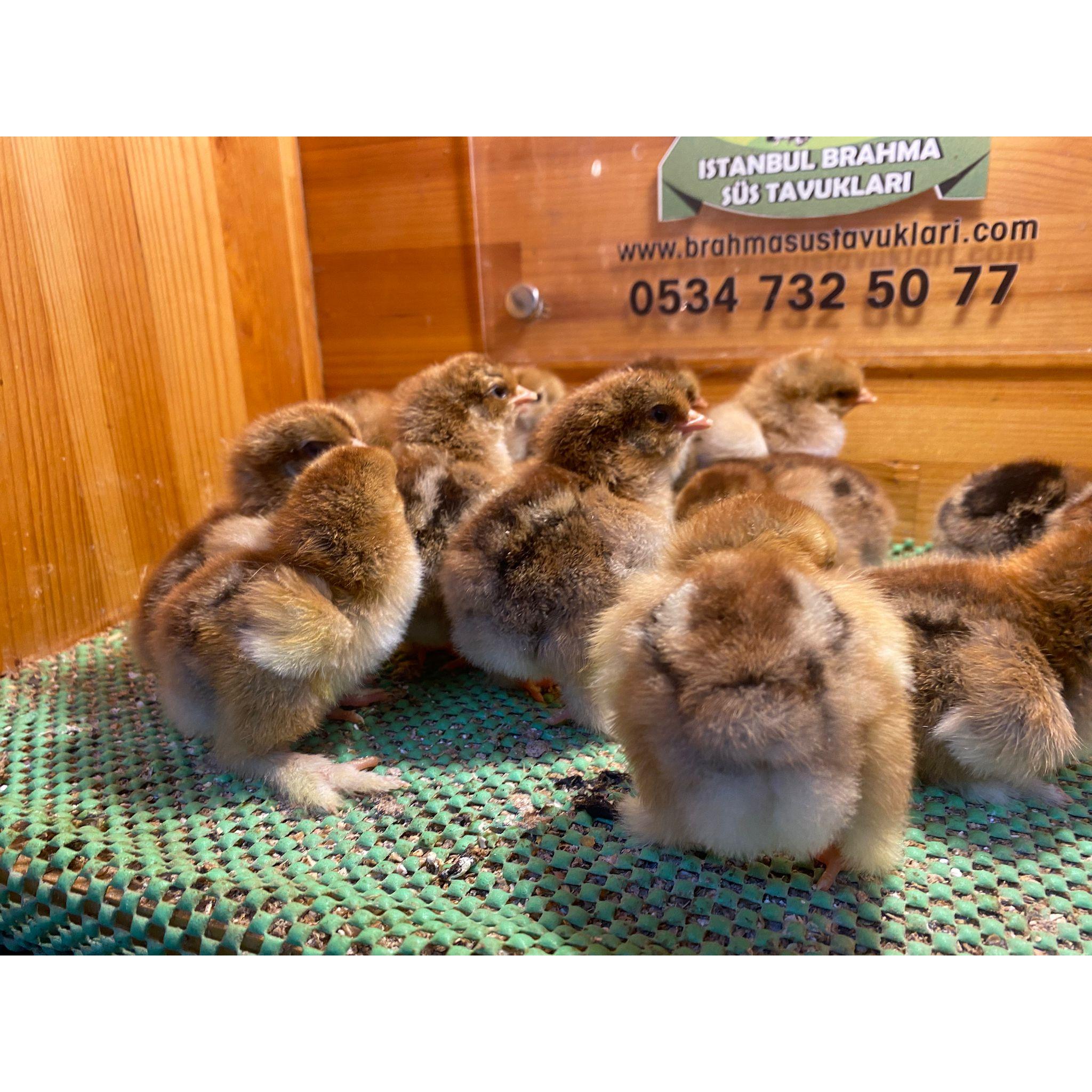İstanbul Süs Tavukları güvencesiyle, Brahma ırkının en parlak ve gösterişli varyantlarından olan Gold Brahma civcivleri. Bu görkemli ırk, yetişkinlikte parlak altın sarısı tüy zemini üzerinde, boyun, kuyruk ve paça kenarlarında koyu (siyah veya kahverengi) bağlama deseni sergiler. Dev cüsseleri, yoğun paçalı bacakları ve uysal mizaçlarıyla kümesinizdeki altın parıltısı olacaktır. Civcivlerimizin sağlık ve ırk safiyeti tarafımızdan güvence altındadır.